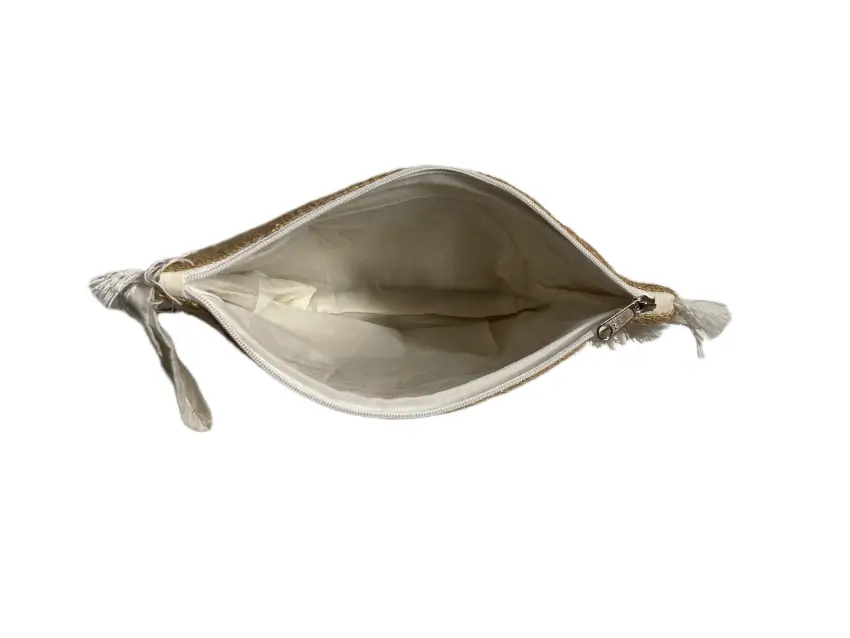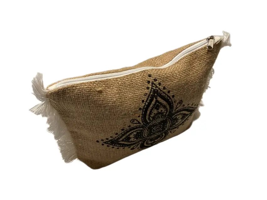 Een klein handtasje met grote uitstraling. Gemaakt van duurzaam jute en bedrukt met een sierlijke bloemvorm, straalt dit tasje eenvoud en elegantie uit.