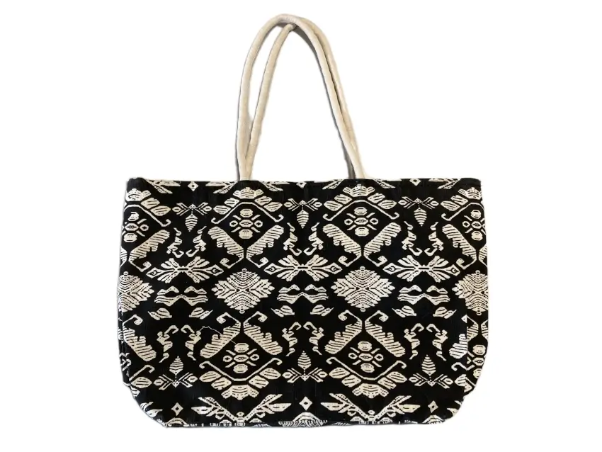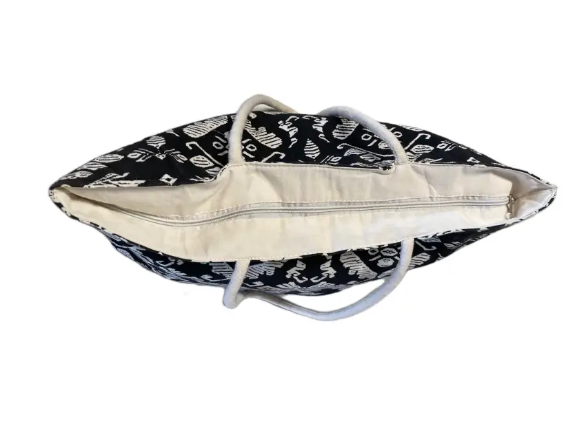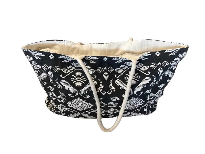 Deze stijlvolle strandtas combineert een trendy zwart-witte print met praktische details. Gemaakt van stevig katoen, is hij niet alleen een duurzame vervanger voor plastic tassen, maar ook een elegante oplossing voor het opbergen van kleine spullen.