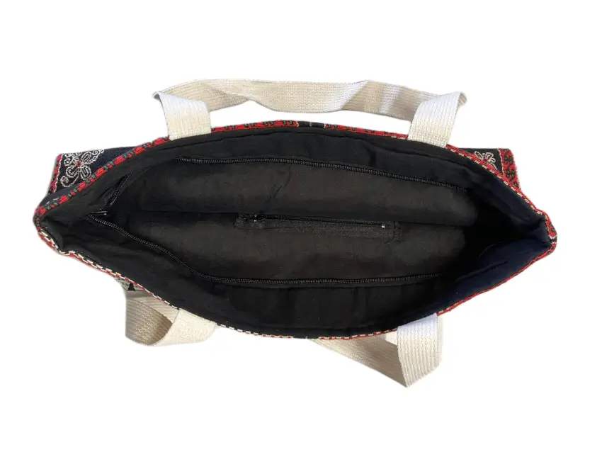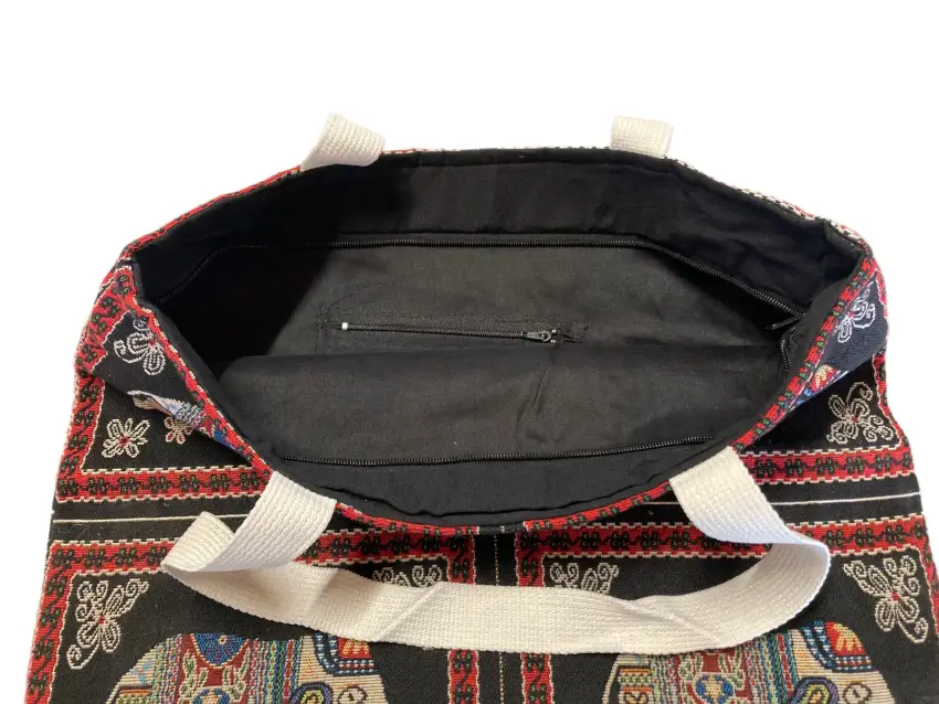 Milieuvriendelijke draagtas van stevig katoen, met de afbeelding van 4 olifanten die kracht, wijsheid en verbondenheid symboliseren. Een stijlvol en duurzaam alternatief voor plastic tassen, met een ritssluiting, zwarte binnenvoering, en een handig binnenzakje.